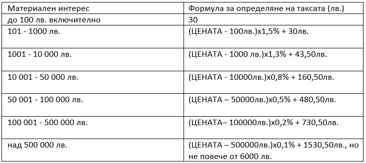 - If the mortgage is contractual, it is established in the form of a notarial deed, and a notarial fee is paid according to the table above, where the material interest is the amount of the loan (it is possible the property costs BGN 300,000 but the loan is only BGN 200,000; in that case this amount will be stated in the mortgage deed and the notarial fee will be calculated on it).
